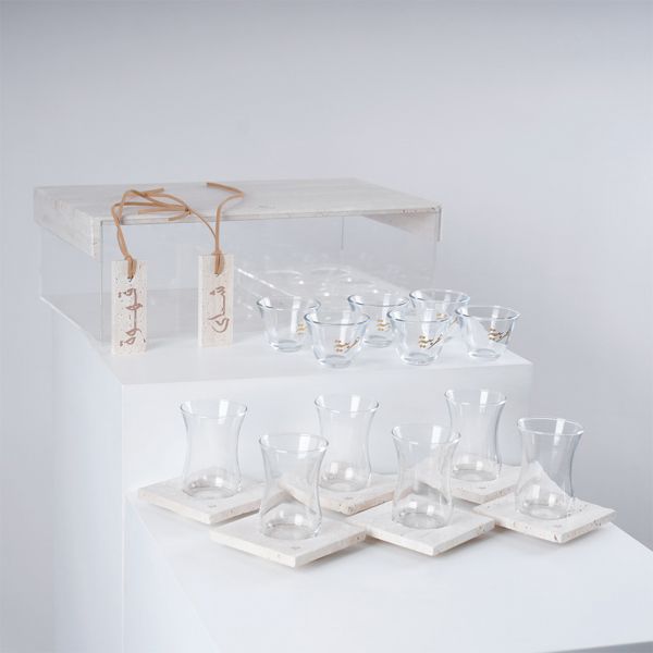 طقم الترافرتين لضيافة الشاي والقهوة يحتوي على صندوق من الاكرليك الشفاف بغطاء من الترافرتين يستخدم كصينية يحتوي على :