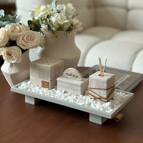 صينية التبخير المميزة ، والتي تقدم تجربة تبخير فريدة للضيوف ، تحتوي على صينية خشبية بها مبخر وفواحة عطرية وصندوق حافظ للبخور من حجر الترافتين مع تزيين قاعدة الصينية بالحصى الطبيعي الابيض ، يمكن اضافة اسم العائلة ، مناسبة لتبخير الضيوف ، واستخدامها لطاولة المدخل للمنزل والمكتب