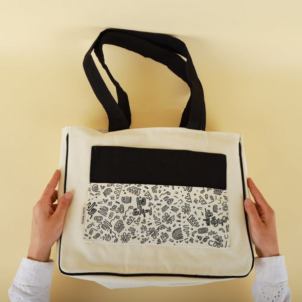 حقيبة قماشية من القطن مع جيب خارجي برسم الدودل و تقسيمات داخلية مناسبة متعددة.سهلة التنظيف من الداخل. بقياس (17x32x40سم)