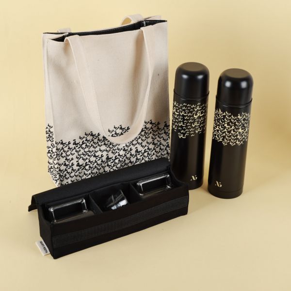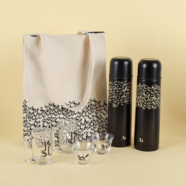 يحتوي الطقم على حقيبة مقاومة للسوائل، وحقيبة صغيرة تحتوي على عدد ٢ فنجان قهوة عربية، و 2 إستكانة شاي مع مسكة