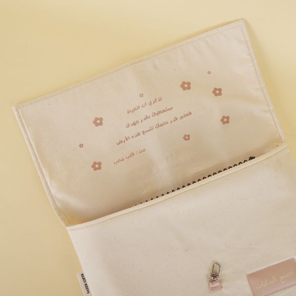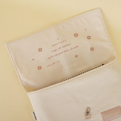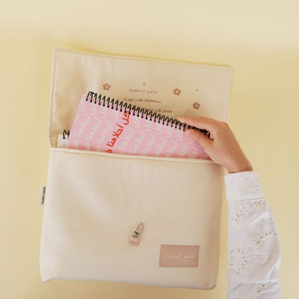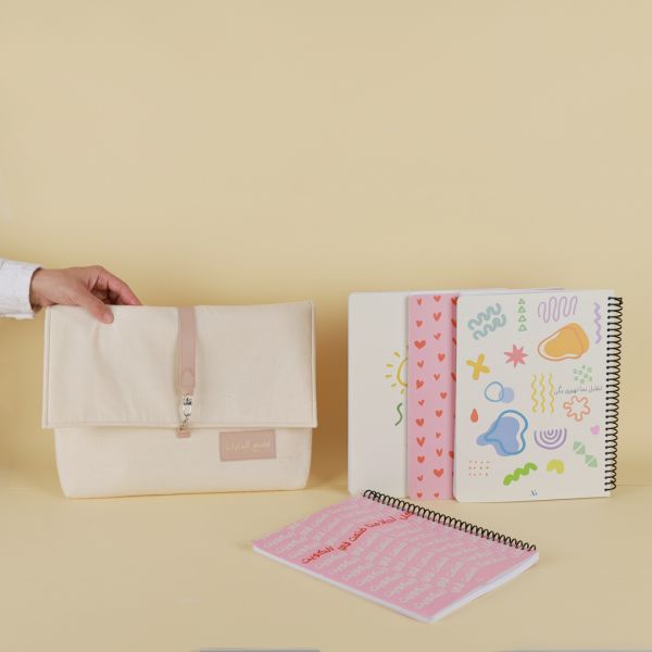 "حقيبة قماشية أنيقة وعملية تحتوي على 4 دفاتر متنوعة: دفتران 100 صفحة ودفتران 80 صفحة، مثالية للدراسة أو التدوين اليومي.