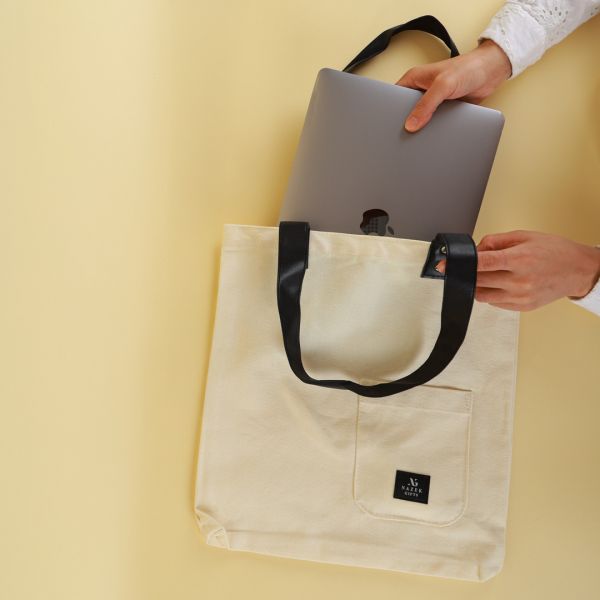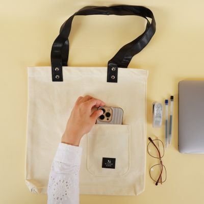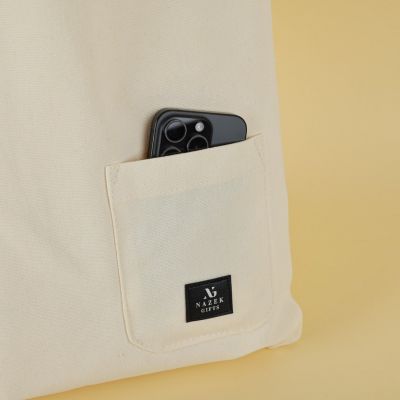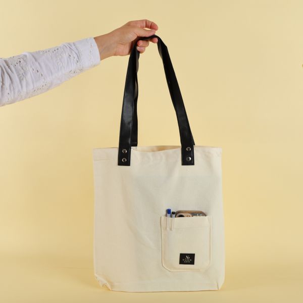 حقيبة قماشية بمقبض من الجلد مع جيب خارجي قياس ( 12x16) سم قياس الحقيبة 36x32 سم