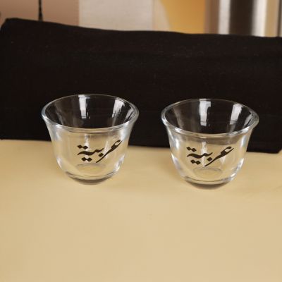 6 glass Arabic coffee cups, hand-printed in black with the word “Arabic”