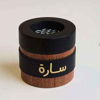 Leather bukhoor bag containing a safe wooden burner with a secure lid, suitable for safely scenting clothes and hair. The bag includes small-sized charcoal, a lighter, a leather envelope for storing incense, along with plucker for incense and charcoal. Bag dimensions: 19x7x7 cm