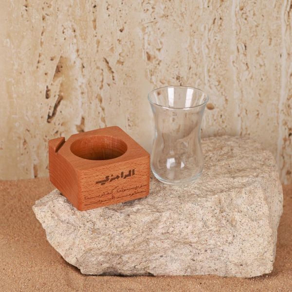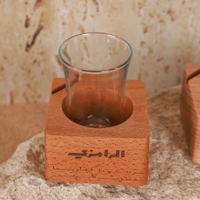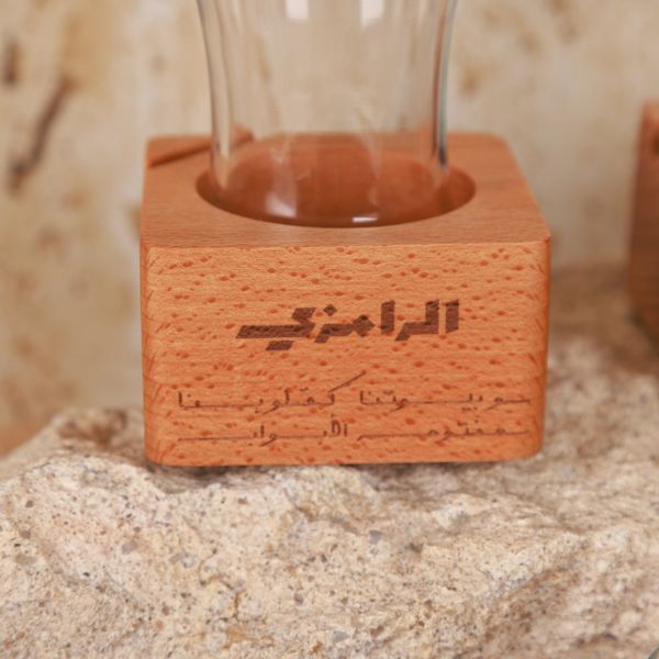 Elegant tea glass holder engraved with the phrase: "بيوتنا كقلوبنا مفتوحة الأبواب"