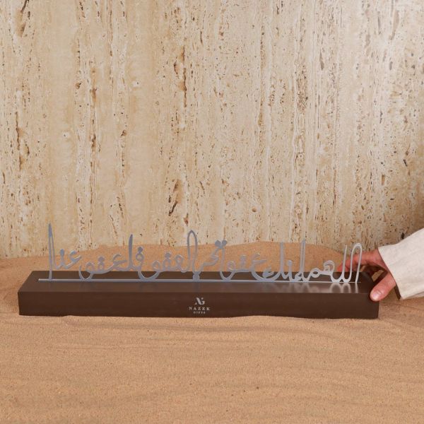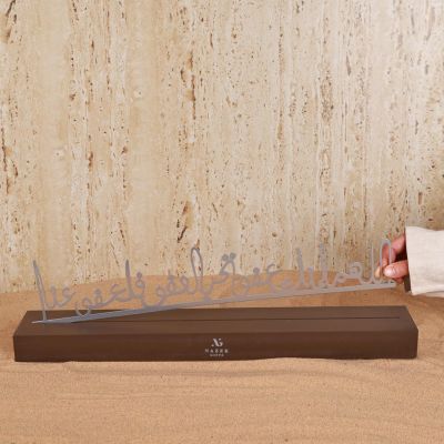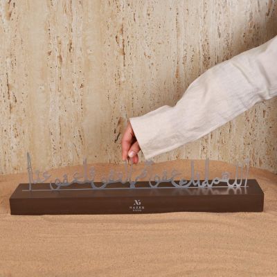 This decoration, made of metal with a wooden base, features a modern design suitable for home or office decor