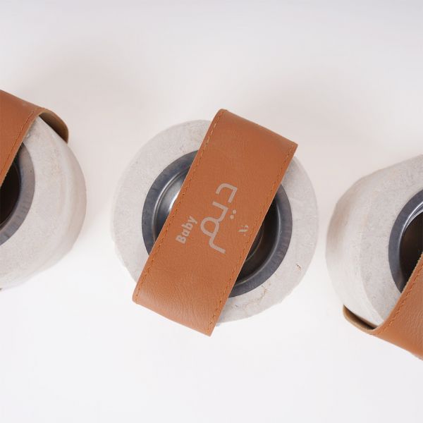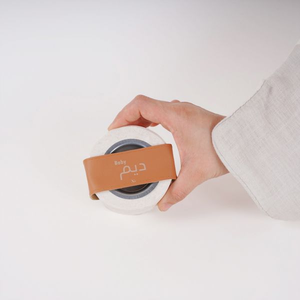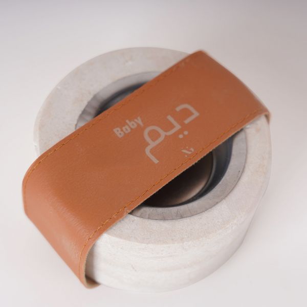 A circular mubkhar made of Travertine stone , with a leather strap, and you can add the name.